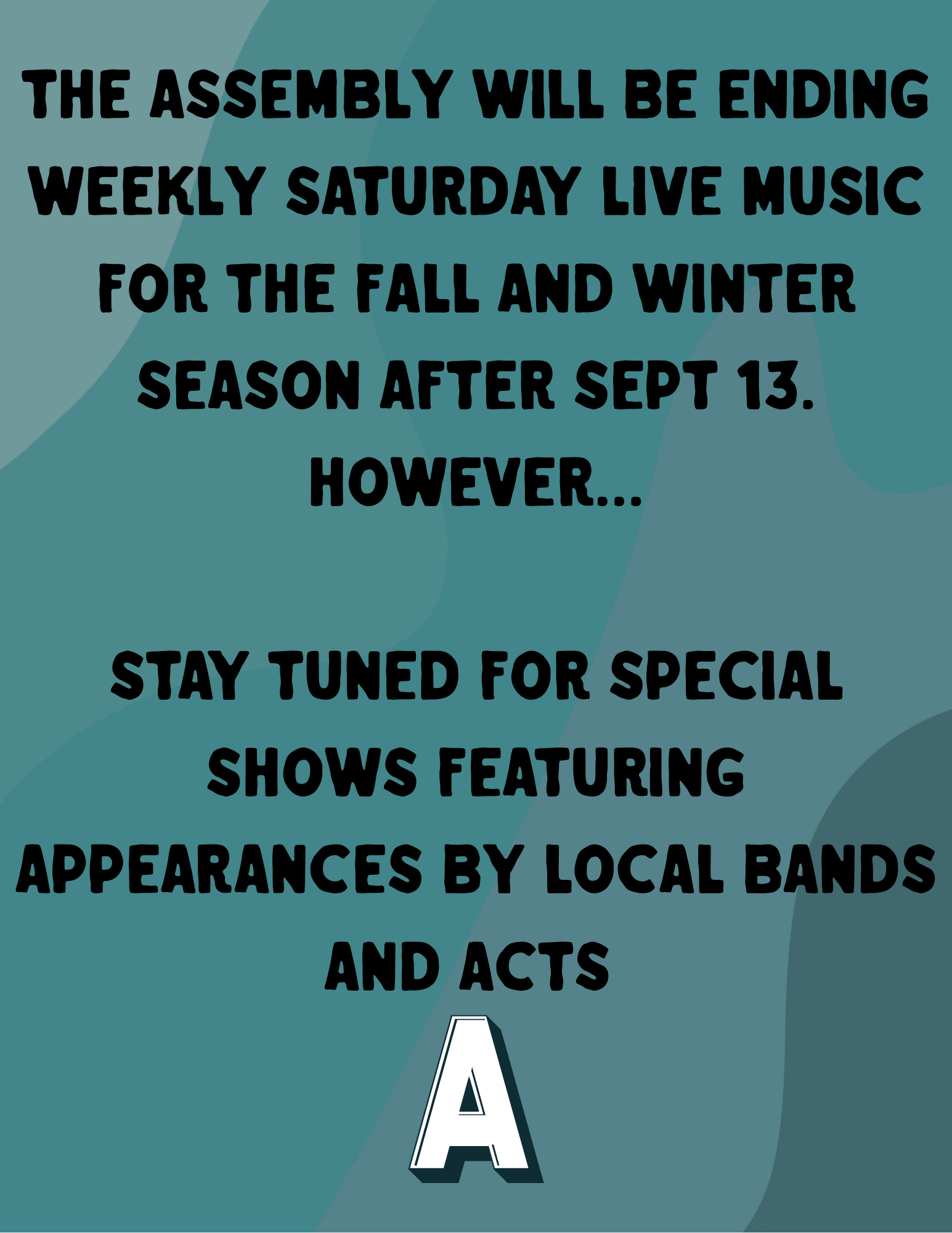 Local Artists showcase their musical talent every Saturday here at Assembly. Saturday's we offer our full menu until 10pm and our late night food menu up until 11:30pm.